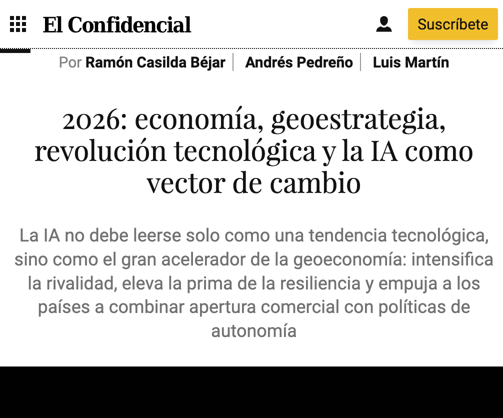Ramón Casilda Béjar, Miembro del Instituto Universitario de Investigación en Estudios Latinoamericanos (IELAT) de la Universidad de Alcalá, Luis Martín «El Druida», fundador de Binomial Consulting & Design y Andrés Pedreño, Fundador de Torre Juana IA HUB y Presidente de 1MillionBot firman este artículo publicado en El Confidencial, que lleva por título «2026: economía, geoestrategia, revolución tecnológica y la IA como vector de cambio»