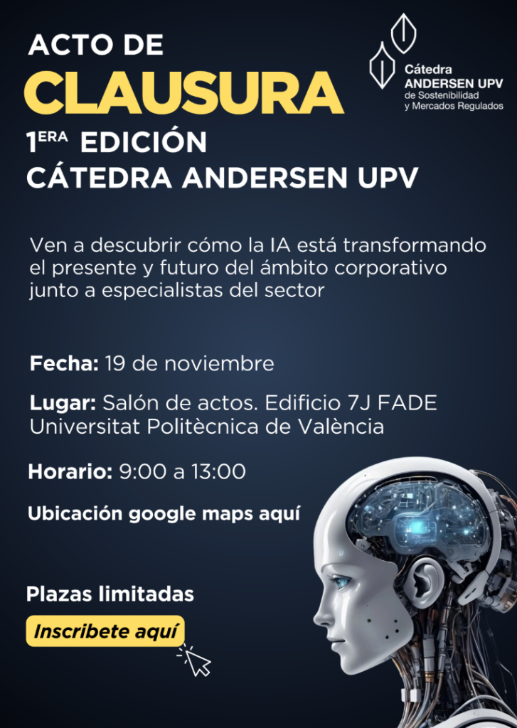 La Universitat Politècnica de València acogerá el próximo 19 de noviembre, de 09:00 a 13:00, el acto de clausura de la 1.ª edición de la Cátedra Andersen UPV, una jornada abierta al público en la que se abordará cómo la inteligencia artificial está transformando el presente y el futuro del ámbito corporativo. El encuentro se celebrará en el Salón de Actos del Edificio 7J de la Facultad de ADE (FADE) y reunirá a destacados especialistas del sector.