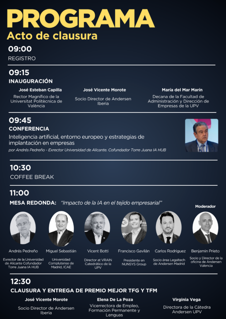 La jornada continuará con una mesa redonda titulada “Impacto de la IA en el tejido empresarial”, en la que participarán figuras de referencia como Miguel Sebastián (Universidad Complutense de Madrid, ICAE), Vicent Botti (Catedrático UPV y director de VRAIN), Francisco Gavilán (Presidente de Nunsys Group) y Benjamín Prieto (Socio y Director de la oficina de Andersen en Valencia). La sesión será moderada por Carlos Rodríguez, socio del área de Legaltech de Andersen Madrid. El evento concluirá con la clausura oficial y la entrega del premio al mejor TFG y TFM, de la mano de José Vicente Morote, Elena de la Poza (Directora de la Cátedra Andersen UPV) y Virginia Vega (Vicerrectora de Empleo, Formación Permanente y Lenguas).