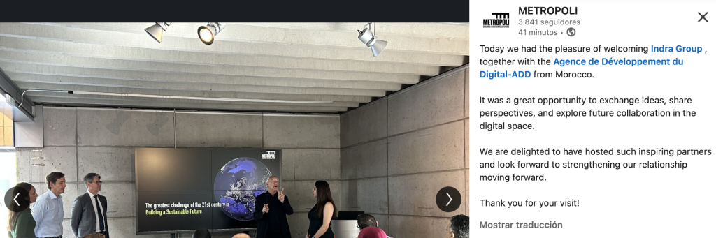 Fundación Metrópoli ha recibido en sus instalaciones a representantes de Indra Group y de la Agence de Développement du Digital (ADD) de Marruecos, en el marco de un encuentro orientado al intercambio de conocimiento y al desarrollo de sinergias estratégicas en el ámbito de la transformación digital.