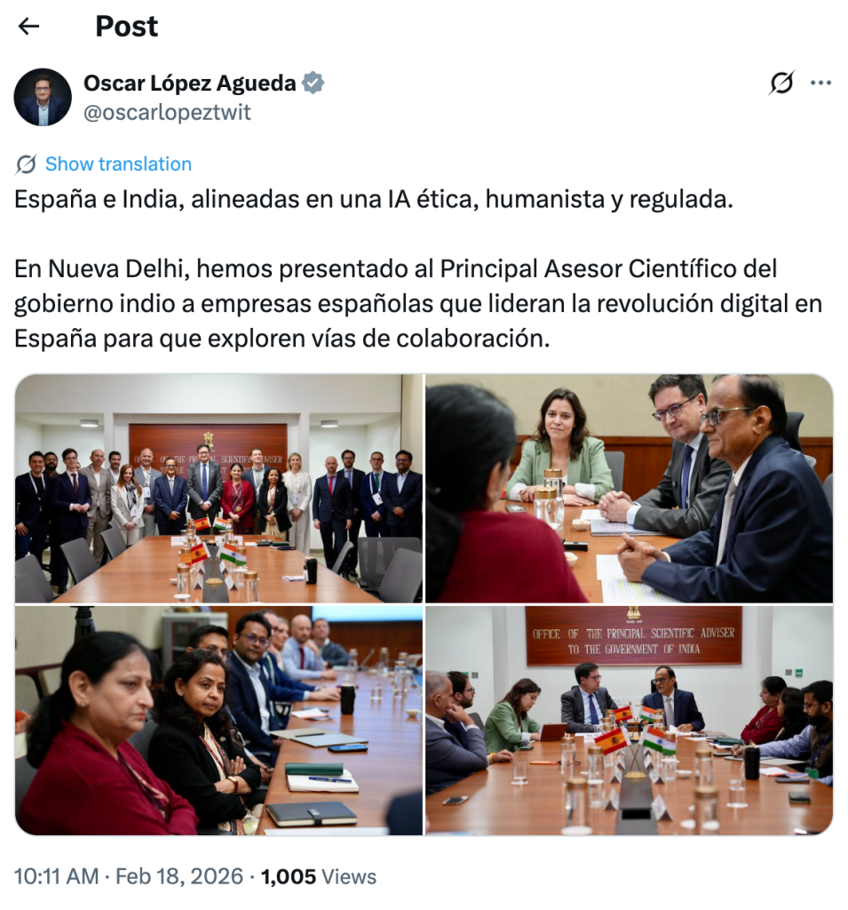 El ministro Óscar López Águeda ha mantenido un encuentro oficial en Nueva Delhi con el Profesor Ajay Kumar Sood, actual Asesor Científico Principal (PSA) del Gobierno de la India. El objetivo de la reunión ha sido presentar a empresas españolas que lideran la revolución digital, entre las que se encuentra 1MillionBot, para explorar vías de colaboración en el ámbito de la inteligencia artificial.